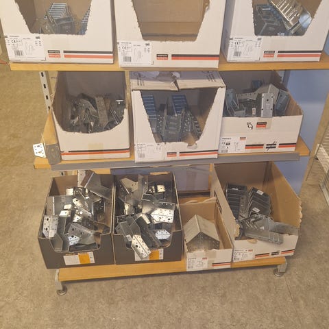 Ukjent merke gamle beslag og hengsler i metall. Pakken inneholder ulike typer rustne beslagplater, vinkelbeslag og hengseldeler. Delene ser ut til å være eldre og kan egne seg til restaurering eller som reservedeler til dører, porter eller andre konstruksjoner der tilsvarende beslag brukes. Materialet er metall med tydelig overflaterust og slitasje. Størrelser og eksakte mål er ikke oppgitt.