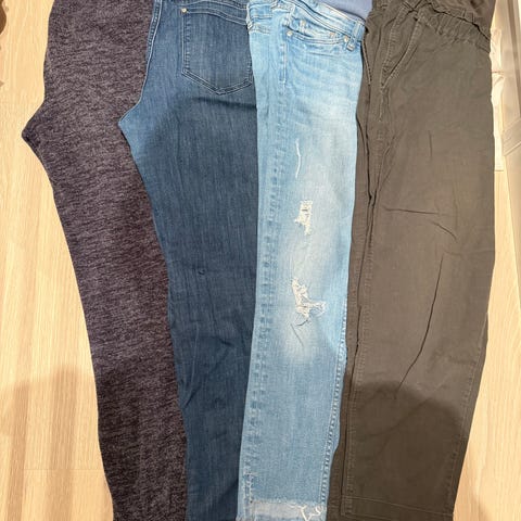 H&M mammaklær i størrelse M / 40 for dame. Pakken inneholder flere plagg, blant annet mammashorts og enkle overdeler/topper. Plaggene har høyt og elastisk liv tilpasset gravidmage. Ulike farger og lengder, egnet til hverdagsbruk under graviditet.