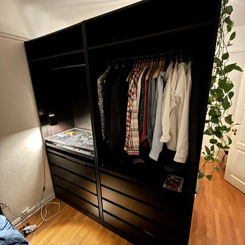 2 stk 100 cm x 201 cm skap. Med følger 6 skuffer til sammen, pluss en dra ut skuff for sko.