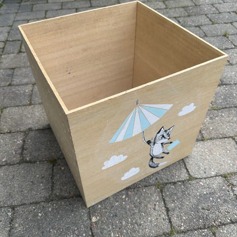 Sne design oppbevaring i grå filt med trykk av anleggsmaskin og traktor på sidene. Boksen har rund utskjæring øverst i front for enkel håndtering. Egnet til oppbevaring av leker, klær eller annet smått utstyr på barnerom eller i oppbevaringshyller.Hel og pen. Passer perfekt i IKEA kallax-hylle🤗