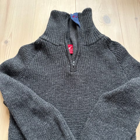 Ulvang genser i ull for herre i størrelse L. Genseren er grå og strikket i ribbestrikket ullmateriale. Den har høy hals med glidelås i front og lange ermer. Passer som mellomlag eller ytterste lag ved kjøligere vær, til hverdagsbruk eller tur.