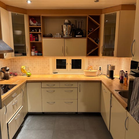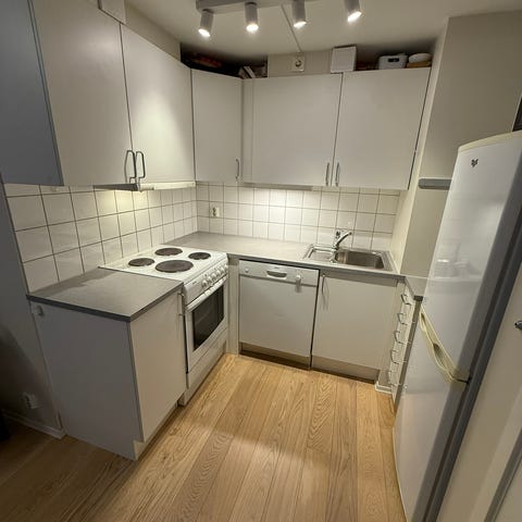 Kjøkkeninnredning bestående av overskap, underskap og skuffer i lys trefarget utførelse med metallhåndtak. Benkeplate i mørk grå laminat med nedfelt oppvaskkum og ettgreps blandebatteri. Flislagt vegg over benkeplate med lyse kvadratiske fliser. Skuffeseksjon med flere skuffer og skap under vask med plass til rør og avløp. Innredningen passer til mindre kjøkken eller hybelkjøkken og gir både benkeplass og oppbevaringsplass for kjøkkenutstyr og servise. Kommer også med ventilator. Gis bort grunnet oppussingsprosjekt.