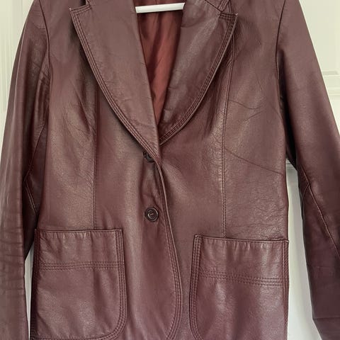 Denne blazeren er 80-talls og har markerte skuldre, smal enkel krage i sort lær og en nydelig rosa innside til å bli glad av. Rette lommer kantet med lær.