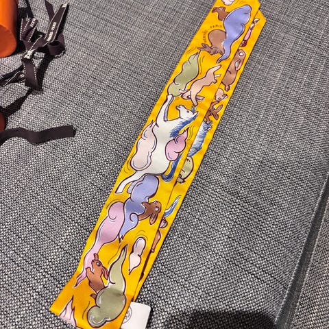 Hermès skjerf i silke i flerfarget design, one size. Skjerfet har et motiv i fine farger. Materialet er 100 % silke ifølge merkelappen. One size gjør at skjerfet kan brukes på flere måter, for eksempel rundt halsen, i håret eller på veskehåndtak. Design og farger kommer frem på bildene.