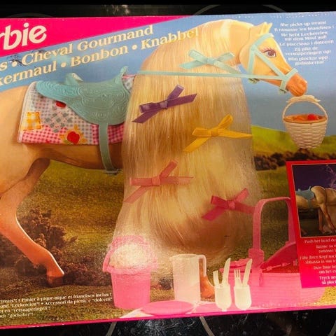 Barbiehest med vogn, seletøy og 4 sko selges.