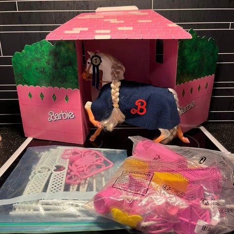 Barbiehest med vogn seletøy og 4 rosa sko