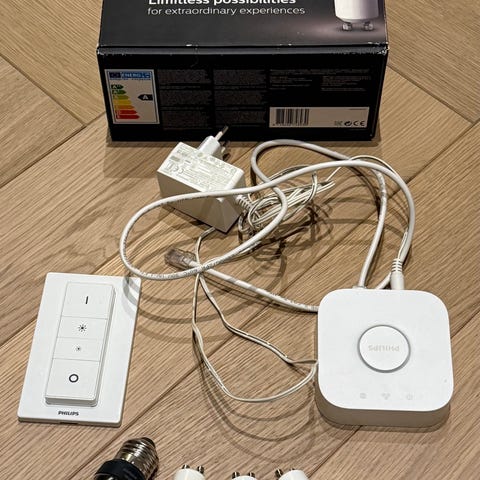 Selger uåpnet Philips Hue startpakke med bridge og 3 fargepærer. Ble kjøpt før flytting, men deretter ikke behov for den. Inneholder: