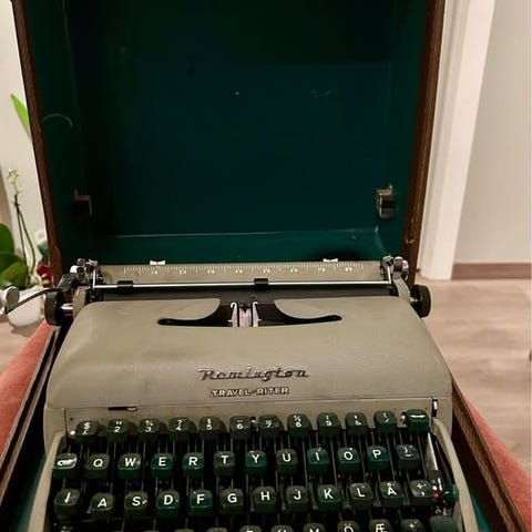 Selger en original Monarch Remington skrivemaskin i bærbar koffert, mulig fra 1964-65. Originalt rensesett kan følge med, samt blåpapir, kopipapir og skrivepapir.