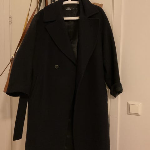 Zara kåpe for dame i størrelse S. Kåpen er grå og laget i ullmateriale. Den har høy hals med knappelukking øverst og skjult knepping i front. Modellen har vide ermer og en lett A-fasong. To skrålommer foran. Passer som ytterjakke i kjøligere vær.