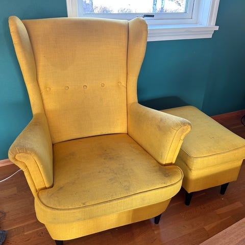 Jeg gir bort to recliner stoler, mørk grønn den ene er litt defekt på høyre armlene etter at barnebarn har satt opp på. Det er lett å fikse for en som er litt handy. Stolen er helt brukbar og fantastisk god å sitte i, og til å sove middagsluren i. Må hentes snarest