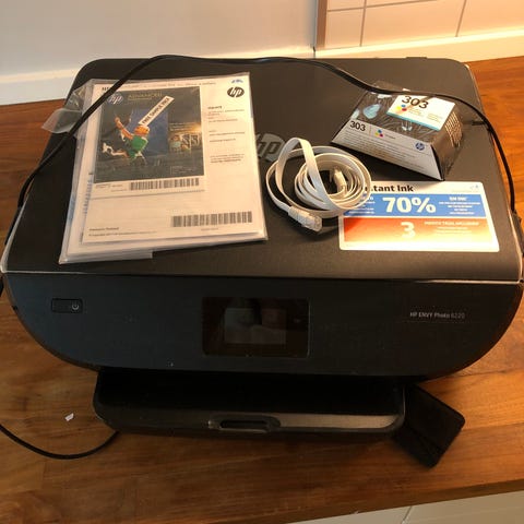 HP Envy Photo 6220 multifunksjonsskriver og uåpnet blekk og fotopapir pakke