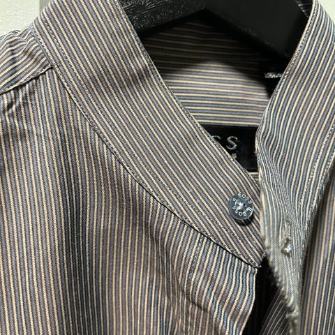 Et fint beige, bomullskjorte med svart og mørke brunt stripper i fint kvalitet og flotte detaljer selges. Kjøpte i feil størrelse desverre. Romslig I størrelsen. Anbefales👌😍