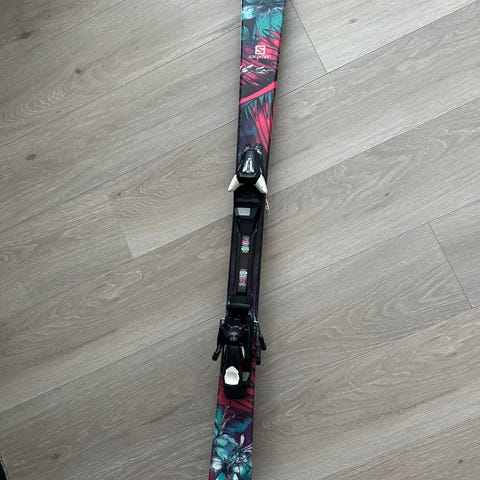Salomon 64 Pintail alpinski med lengde 130 cm. Skiene har rød og hvit design. Beregnet for alpint bruk. Bindingssystem er montert på skiene