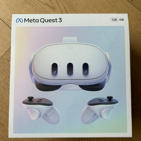 Meta Quest 3 VR-headset med tilhørende håndkontrollere. Headsettet er i hvit farge med justerbar hodestropp. Kontrollerne har flere knapper og styrespak for interaksjon i VR-miljøer. Produktet leveres med original emballasje fra Meta Quest 3-serien, som vist på bildene.