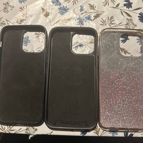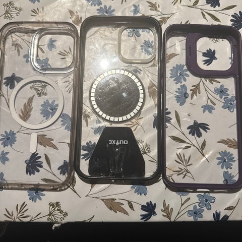 Apple telefondeksler med MagSafe-utforming. Pakken inneholder flere deksler, blant annet et gjennomsiktig blått deksel med blomstermønster og integrert MagSafe-ring, samt mørke deksler med utskjæring for kameramodul. Deksler gir beskyttelse rundt kanter og bakside på kompatible iPhone-modeller og er tilpasset trådløs lading med MagSafe der ringen er integrert. Passform og eksakt modelltilhørighet bør kontrolleres mot egen iPhone før bruk.