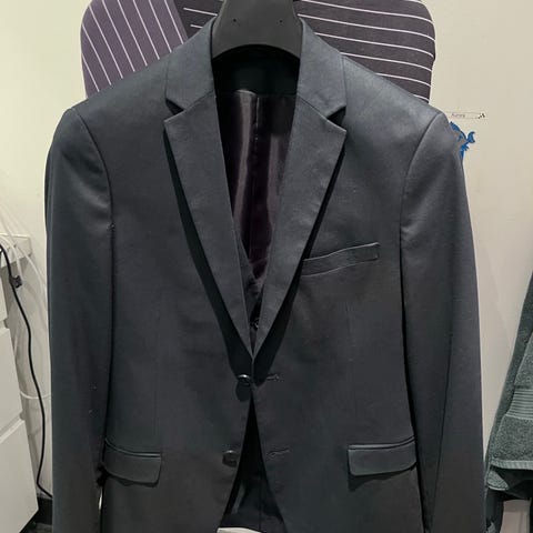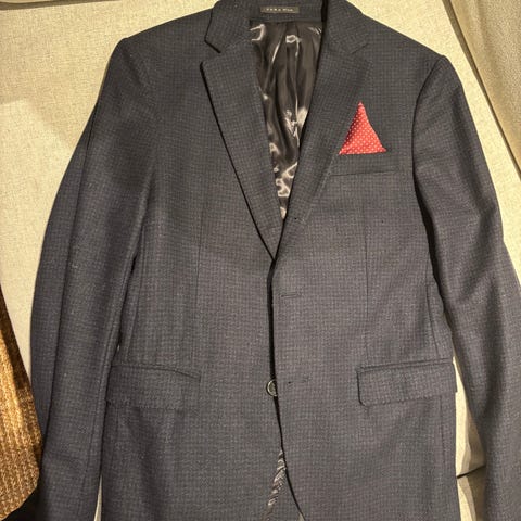 Jameson pin stripe blazer for herre i størrelse 46 som tilsvarer small. Jakken er laget i ullmateriale med innslag av andre fibre, og har klassisk snitt med jakkeslag, to knapper i front og flere lommer. Fôret innside med mønstret stoff. Fargen er grå. Egnet som del av dress eller til penere antrekk.