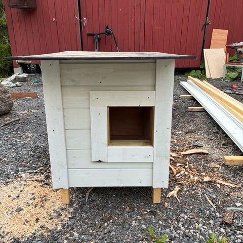 Hundehus i tre med flatt tak. Huset er bygget i panelbord og står på ben som løfter det fra underlaget. Inngangen er rektangulær og plassert på den ene langsiden. Innvendig er vegger og gulv i tre. Isolert i vegger, gulv, tak med isopor så dette kan fint brukes hele året. Kjølig på sommeren og varmt om vinteren. Egner seg som utehus eller ly for hund, eventuelt som lite hus til andre dyr med tilsvarende størrelse. Mål på åpningen fremgår av bildene med tomstokk.