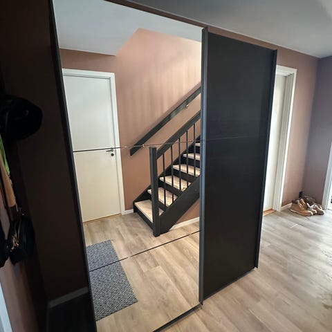 Dobbelt speilskap med skyvedører. Pax skap med Auli dører fra IKEA.