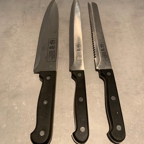 Hei! Jeg selger et praktisk knivsett med 5 kjøkkenkniver. Knivene er brukt, men fungerer fortsatt godt og er fine til daglig bruk. Selges kun fordi jeg har fått nytt knivsett til jul. Det kommer med en kokkekniv, en filetkniv, brødkniv, universal kniv og en liten skrellekniv. Knivblokken kommer også med.