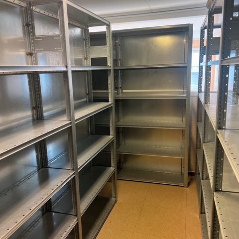 Reolen består av stående stolper og horisontale bærejern i metall, med netthyller som legges oppå. Løsningen er egnet for lagring av varer i butikk, lagerrom eller bod. Hyllesystemet kan tilpasses i høyde ved å flytte bærejernene, og netthyllene gir god oversikt og lufting rundt varene. Passer til oppbevaring av esker, matvarer og annet utstyr i næringslokaler eller private lagringsrom.