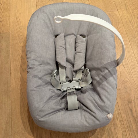 Selger en lite og pent brukt newborn seat fra Stokke i lysgrå. Hvite fotstøtter medfølger + bruksanvisning.