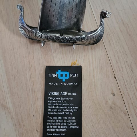 Håndstøpt TPB tinn vikingskip skål med figur