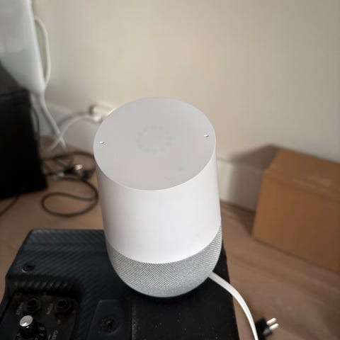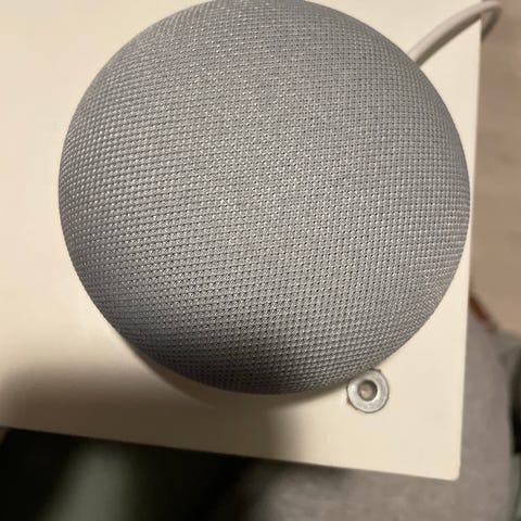 Tre Google Home Mini. Eldre versjon, sannsynligvis første generasjon.