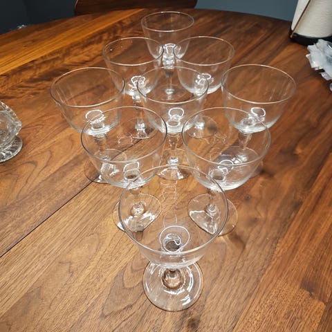Glassene fremstår som ubrukte – helt glatte, uten riper eller skår. Klart og fint glass med dekorativ stett.