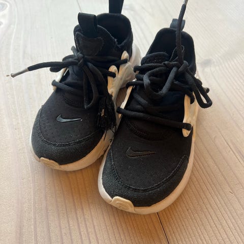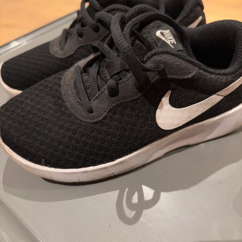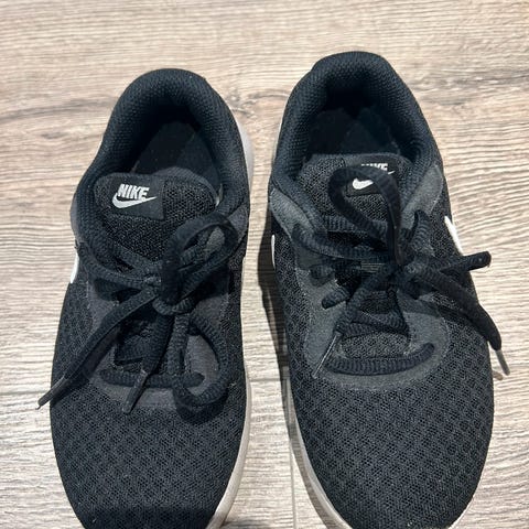 Nike joggesko for barn i størrelse 38,5. Skoene er unisex og har svart overdel med hvit såle og hvit Nike-logo. Overdelen er i pustende mesh-materiale med lisser for justering. Yttersålen er i gummi med mønster for grep. Egner seg til hverdagsbruk og lett trening for barn og unge.