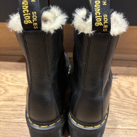 Dr. Martens vinterstøvler i størrelse 37. Støvlene er i svart skinn med snøring foran og karakteristiske gule sømmer langs sålen. Innsiden har fôr som gir ekstra varme til bruk i kaldere vær. Yttersålen er kraftig og mønstret for godt grep. Passer som varme hverdagssko eller vinterstøvler. Kjøpt for rundt 2800kr