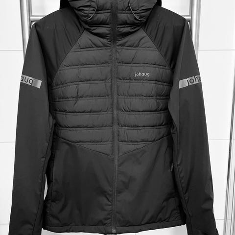 Johaug langrennsjakke i str. M. Jakken har hette og glidelås foran. Den er tofarget i hvit og oransje, med vattert frontparti og glattere stoff nederst og på ryggen. Ermene har refleksdetaljer for bedre synlighet.