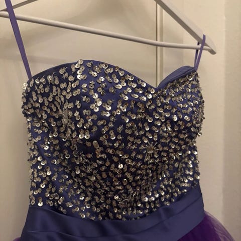 Nydelig ballkjole/festkjole i størrelse 36. Kjolen har snøring på ryggen og passer fint for deg som bruker str. 36-40. Kjolen er blå og har et langt, voluminøst skjørt i flere lag tyll. Overdelen er tettsittende med dekorative detaljer og perleaktig bånd i midjen.