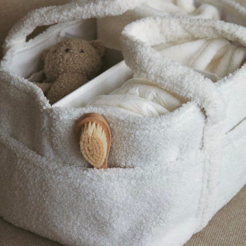 Stelleveske i myk teddy-materiale med flere praktiske rom for organisering av utstyr til bleieskift og stell.