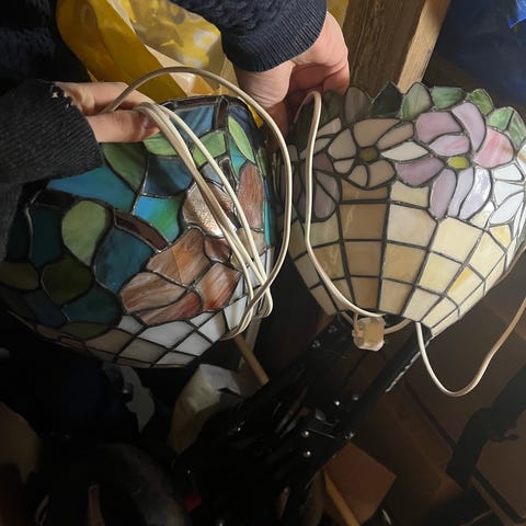 Blomsterformet lampe. 2 glasskupler formet som lilje. Lampe H: 44 cm. B: 34 cm. Pen lampe som virker.