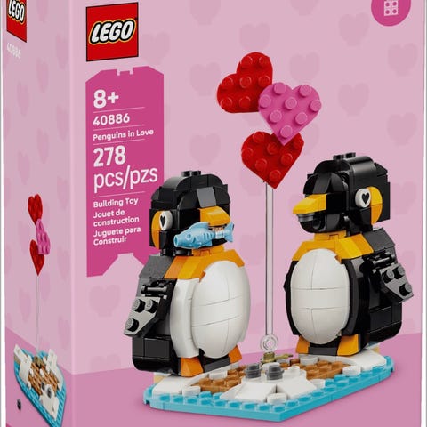 LEGO 40886 Penguins in Love byggesett. Settet består av 278 deler og bygger to pingvinfigurer som står på en liten base med ismotiv og hjerteformede elementer.