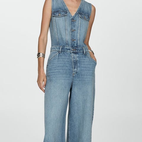 Denim style cotton fabric, recycled cotton-blend fabric, straight design, long design, lapel-collar V-neck collar, long sleeve with buttoned cuffs, two patch pockets on the front, two side patch pockets, two patch pockets on the back, loops, button fastening on the upper body, and a zipper below the belly button.