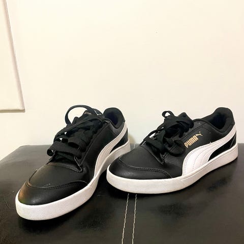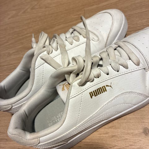 Puma sneakers joggesko i størrelse 43. Modellen har svart overdel med hvit Puma-logo og hvit såle. Klassisk snøring foran og lav ankelhøyde. Passer til hverdagsbruk og fritidsaktiviteter.