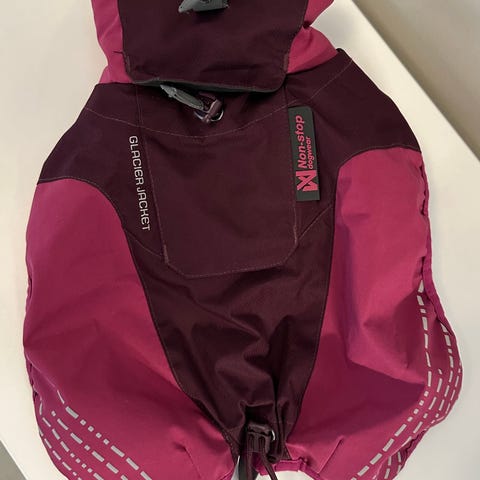Non-stop dogwear Glacier Jacket hundejakke i størrelse 55. Jakken er i fargene oransje og marineblå, med refleksdetaljer for bedre synlighet i mørket. Modellen har isolerende fyll (3M isolasjon ifølge emballasjen), glatt innerfôr og justerbare stropper under magen for god passform. Egnet som varmende ytterlag til hund på tur og i kaldt vær.