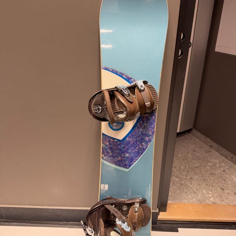Snowboard med bindinger. Brettet har grønn overside og flerfarget grafikk på undersiden. Enkle plastbindinger er montert på brettet. Passer til bruk i alpinbakke for snowboardkjøring. Størrelse, merke og modell er ikke oppgitt.
