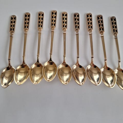 Fullt sett med 12 mokkaskjeer i mønsteret kornblomst fra David Andersen - disse er meget gamle, trolig antikke og kommer i original oppbevaringseske. Laget i 925 sølv, og total vekt er 90 gram, så bare dagens vrakpris er 1665,90 - selges samlet for 3000,- ( 250,- pr stykk)