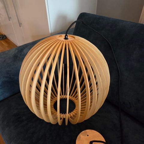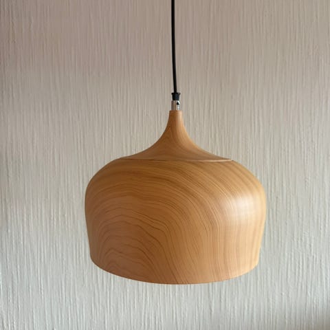 Den lagdelte konstruksjonen gir en solid og ugjennomsiktig skjerm, samtidig som lampen beholder et lett og luftig uttrykk. Overflaten er forseglet med matt lakk som fremhever treets naturlige struktur og gir en varm, taktil følelse. Lampe avgir en organisk belysning med subtil struktur.
