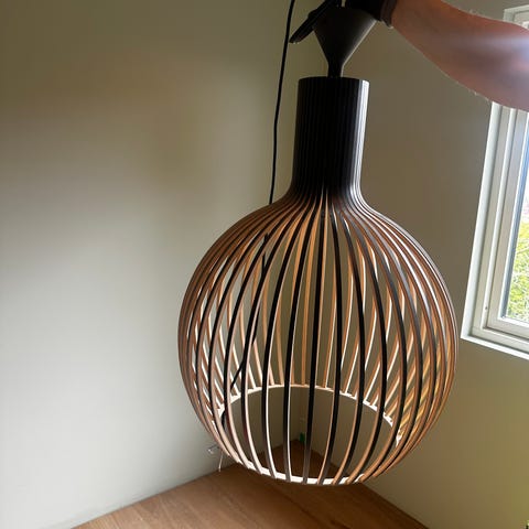 Lampeskjermen leveres med en sort og minimalistisk lampekopp, og sort tekstilkledd ledning. Dette er en tidløs designlampe som passer perfekt over spisebordet, i stuen eller som et statement i rom med god takhøyde.