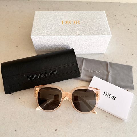 Disse er perfekte for deg som ønsker en sofistikert look. Solbrillene er produsert i Italia og bærer det ikoniske Dior-merket på sidene.