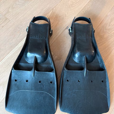 XXL svømmeføtter i svart gummi. Modellen har justerbar hælrem og er merket med størrelse XXL. Passer til bruk ved dykking og snorkling