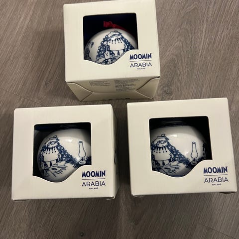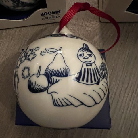 Arabia julekule i porselen med blå-hvitt motiv. Kulen har rødt opphengsbånd og er laget for bruk som juledekorasjon på juletre eller andre steder i hjemmet i juleperioden