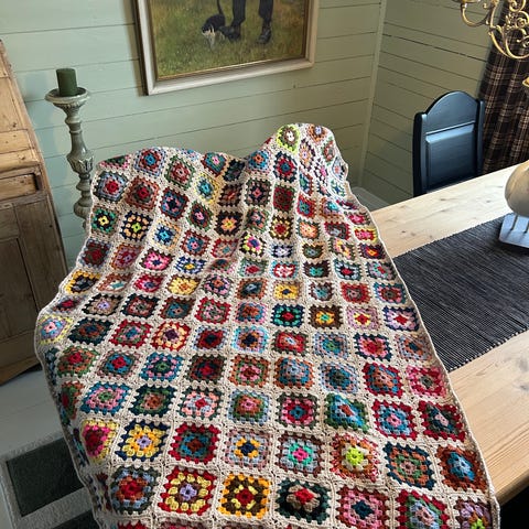 Stort og vakkert håndheklet bestemorteppe i ull