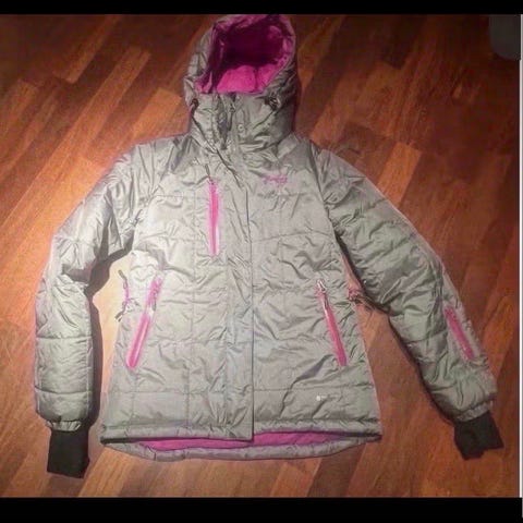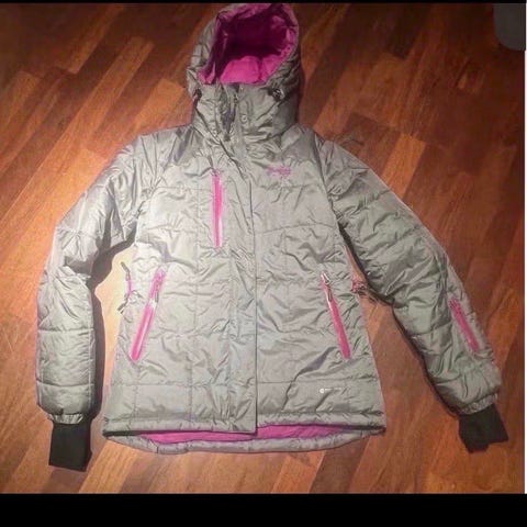 Bergans Annet yttertøy for kvinner i størrelse M. Jakken er grå og laget av dun, egnet for kaldt vær. Den har hette og glidelåser med rosa detaljer, og er designet for å gi isolasjon og komfort ved utendørs bruk.