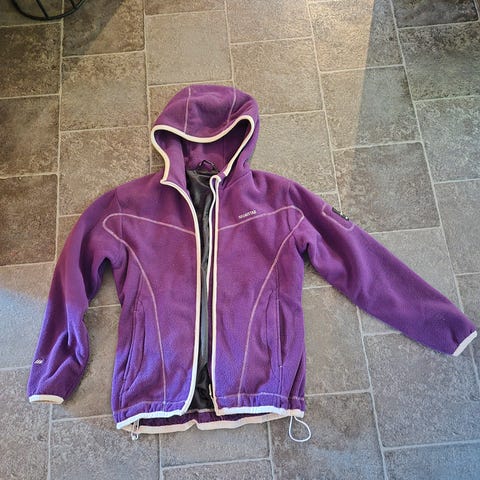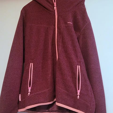 Tykk fleece jakke med hette,glidelås og lommer med glidelås.Feminin innsving i livet.Hvit bunn og lys oliven / khakigrønt for,hette og mønster som ser ut som greiner.