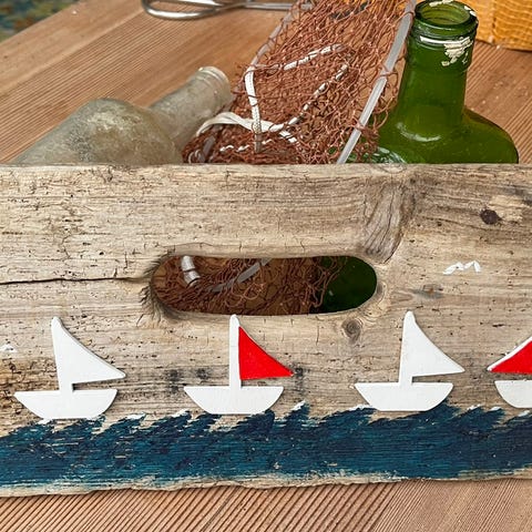 Veggbilde laget av drivved med motiv av seilbåter. Nederst er det malt et blått felt som forestiller hav, og foran er det festet små seilbåter i hvitt med ett rødt seil. Bildet har et rustikt preg med synlig trestruktur og ujevn overflate. Egner seg som veggdekor, spesielt i maritime eller kystinspirerte interiører.