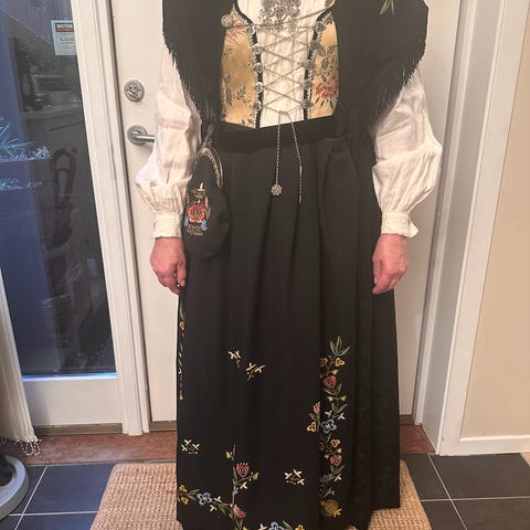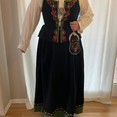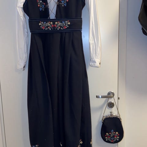 Festdrakt str S/M. Skjørtet er bruktfunn. Lengde fra liv til skjørtekant 100 cm. Vesten er kjøpt ny og redesignet. Vesken er sydd av ulike rester - kan brukes begge veier. Skjorte er sydd av duk i bomullsstoff. Ny som skjorte. Brukt som duk. Brosjene følger med.